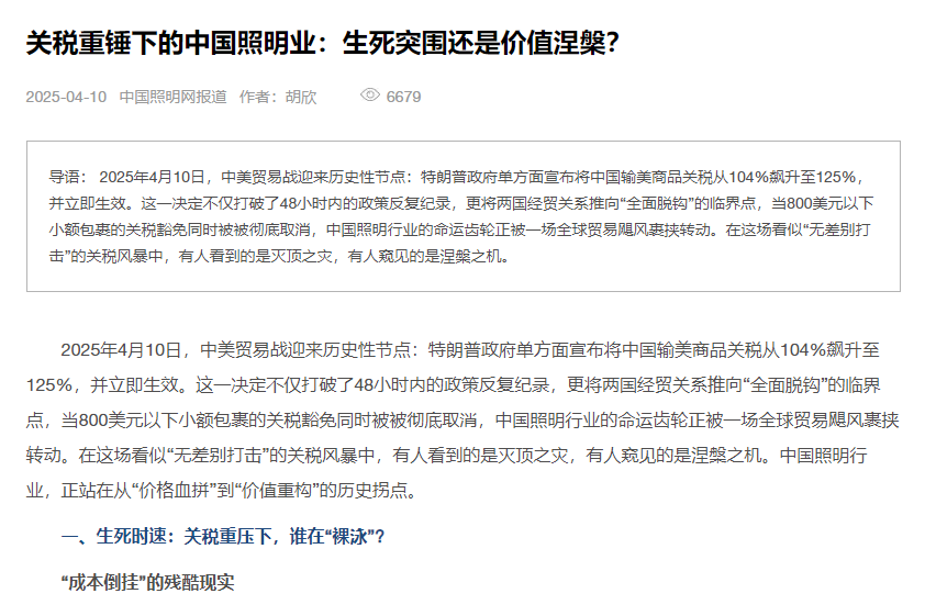 2025年4月10日,中美貿(mào)易戰(zhàn)迎來(lái)歷史性節(jié)點(diǎn):特朗普政府單方面宣布將中國(guó)輸美商品關(guān)稅從104%飆升至125%,并立即生效。這一決定不僅打破了48小時(shí)內(nèi)的政策反復(fù)紀(jì)錄,更將兩國(guó)經(jīng)貿(mào)關(guān)系推向“全面脫鉤”的臨界點(diǎn),當(dāng)800美元以下小額包裹的關(guān)稅豁免同時(shí)被被徹底取消,中國(guó)照明行業(yè)的命運(yùn)齒輪正被一場(chǎng)全球貿(mào)易颶風(fēng)裹挾轉(zhuǎn)動(dòng)。在這場(chǎng)看似“無(wú)差別打擊”的關(guān)稅風(fēng)暴中,有人看到的是滅頂之災(zāi),有人窺見的是涅槃之機(jī)。中國(guó)照明行業(yè),正站在從“價(jià)格血拼”到“價(jià)值重構(gòu)”的歷史拐點(diǎn)。